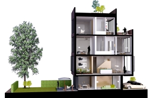 Woningcorporatie “de Key” biedt de mogelijkheid aan particulieren zelf hun woning te bouwen in IJburg in blok 59. Ter inspiratie staan op de site www.zelfbouwblok59 een aantal inspirerende voorbeelden, waaronder dit ontwerp. Loftwonen op IJburg. Boven een begane grondverdieping met een netto hoogte van 2,65m, die te gebruiken is als praktijkruimte, maar ook een aanvulling kan zijn op het woonprogramma, bevinden zich in dit ontwerp drie verdiepingen met een netto hoogte van 3,70m. in combinatie met de royale breedte van