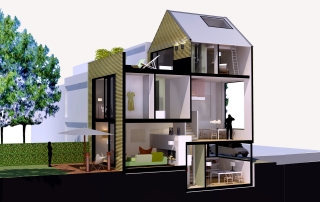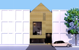 De keuze voor een dwarskap zorgt voor extra nadruk op het individuele karakter van de woning. De ruimte op de tweede verdieping krijgt hierdoor bovendien zolderkwaliteit. Achter de latten in de gevel zit een raam, zonder het abstracte gevelbeeld van de woning te verstoren.