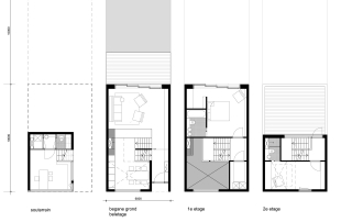 Doordat deze verdieping een halve verdieping is verhoogd, is er privacy maar toch contact met de straat. Door de achterste helft van de woning wel op maaiveldniveau te situeren ontstaan er van de ene verdieping naar de andere mooie doorkijken.