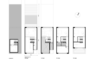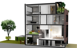 Een halve souterrainverdieping maakt ruimte om, binnen de toegestane hoogte, een klassieke bel-etage te maken. Doordat deze verdieping een halve verdieping is verhoogd, is er privacy maar toch contact met de straat. Door de achterste helft van de woning wel op maaiveldniveau te situeren ontstaan er van de ene verdieping naar de andere mooie doorkijken. Door een vouwwand op de beletage aan de voorkant te maken, krijgt de – op het zuiden gelegen- keuken de kwaliteit van een terras. De materiaalkeuze is gericht op minimale onderhoudskosten in de toekomst, en heeft een chique uitstraling.